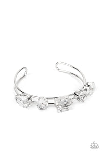 Set in elevated, silver-pronged settings, an oversized collection of white gems adorns the top of an airy silver cuff. Featuring various shapes, the oversized collection showcases endless light-catching texture across its faceted surface, creating blinding bling atop the wrist.