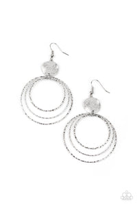 A shimmery wavy silver disc links atop a collection of three delicately hammered silver rings in concentric sizes for an out-of-this-world finish. Earring attaches to a standard fishhook fitting.