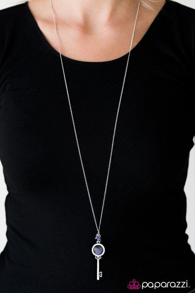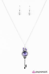 A luminescent purple stone is pressed into a silver key charm, creating a colorful pendant. Infused with iridescent purple beading, the silver key is encrusted in glittery white rhinestones for a dazzling finish. Features an adjustable clasp closure.