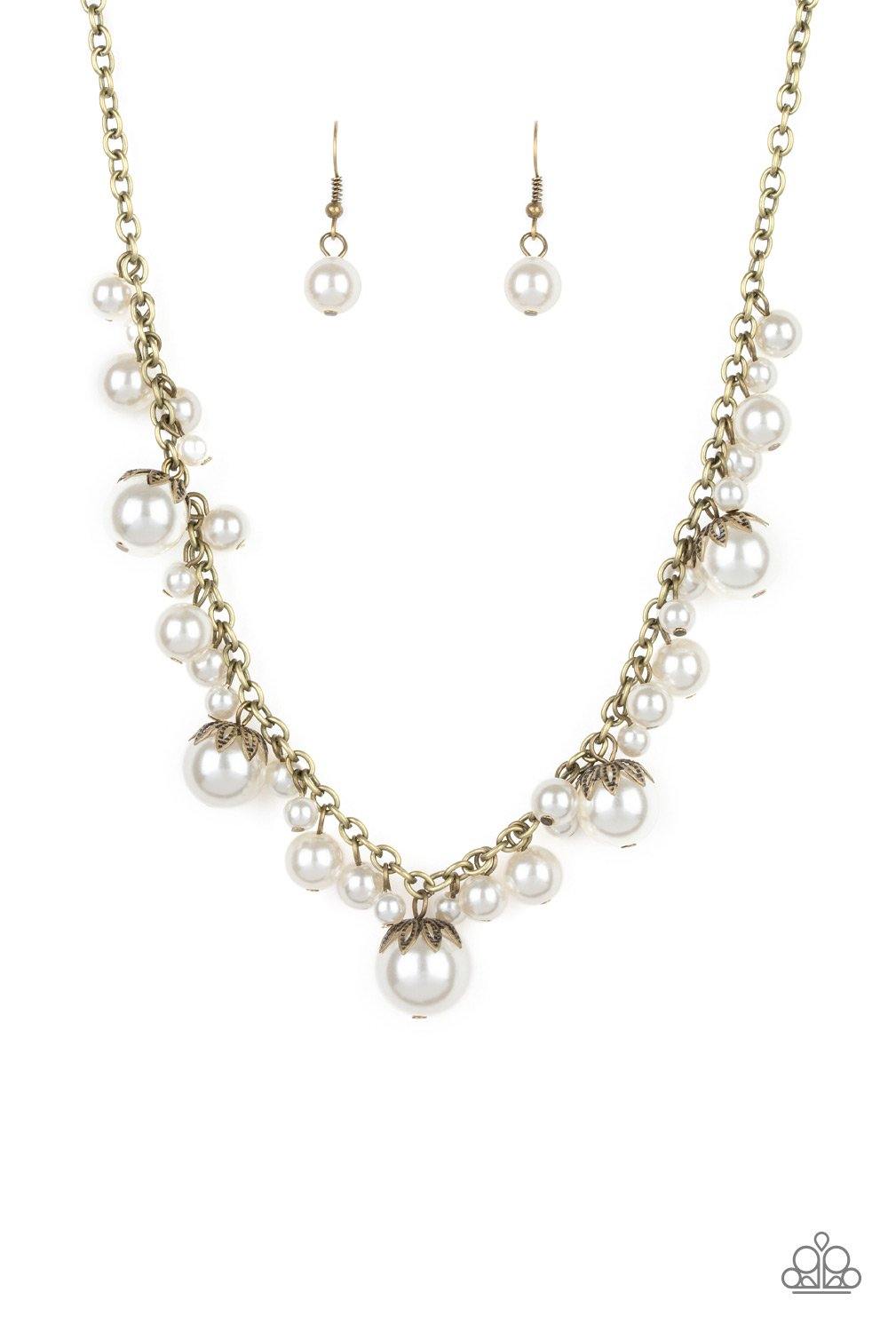 Oversized white pearls featuring leafy brass fittings and a collection of bubbly white pearls swing from the bottom of an antiqued brass chain, creating a vintage inspired fringe below the collar. Features an adjustable clasp closure.