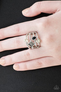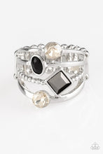 Varying in shape and shimmer, mismatched multicolored rhinestones are scattered across arcing silver bands for an edgy look. Features a stretchy band for a flexible fit.