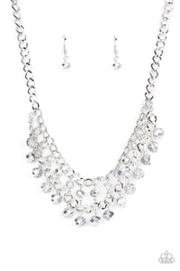 Flecked in metallic accents, two rows of silvery crystal-like beads cascade from the bottom of two interlocking silver chains, resulting in a radiant fringe below the collar. Features an adjustable clasp closure.