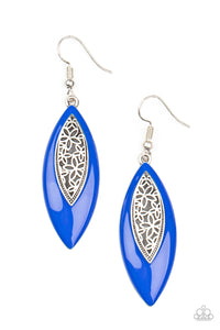 Asymmetrically bordered in a bright Mykonos Blue frame, airy silver filigree blooms along the center of a colorful lure for a seasonal flair. Earring attaches to a standard fishhook fitting.