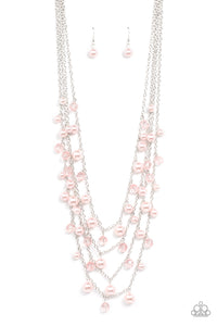 Row after row of bubbly pink pearls and glittery crystal-like beads swing from layered silver chains across the chest, creating a noise-making display. Features an adjustable clasp closure.