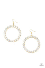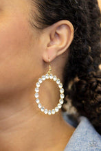 Featuring sleek gold fittings, oversized white rhinestones coalesce into a blinding hoop for a glamorous look. Earring attaches to a standard fishhook fitting.