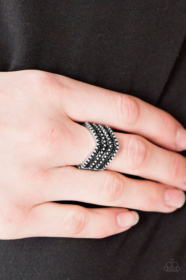 Painted in streaks of black, studded silver bands wave across the finger for a tactile tribal look. Features a stretchy band for a flexible fit.