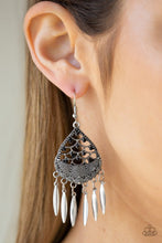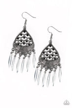Etched in zigzagging textures, a black beaded silver frame gives way to a fringe of flared silver bars for a dramatic tribal inspired look. Earring attaches to a standard fishhook fitting.