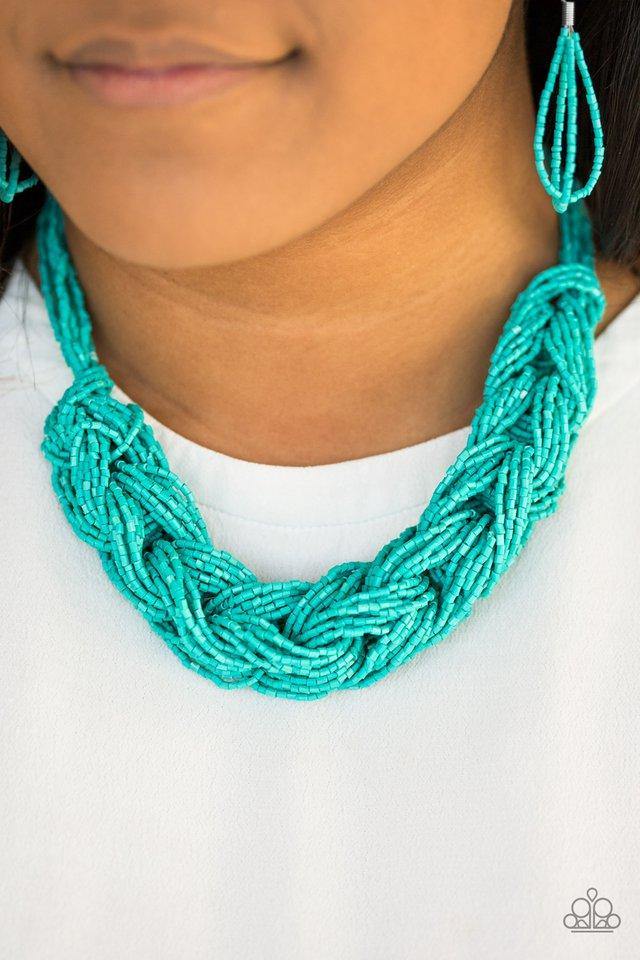 Brushed in a refreshing finish, countless strands of turquoise seed beads weave into a bulky square braid below the collar. Features an adjustable clasp closure.