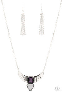 Pairs of faceted silver beads and glassy white emerald cut gems flank an oversized emerald cut purple gem atop an antiqued silver half moon frame. A smoky triangular cut gem adorns the bottom of the pendant, creating a twinkly talisman at the bottom of a classic silver chain. Features an adjustable clasp closure.